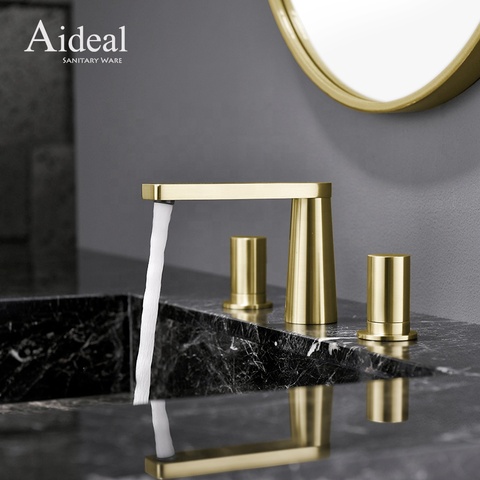 Aideal 3 agujeros manijas dobles PVD oro cepillado baño vanidad fregadero mezcladores con cartucho de cerámica grifos medidos para Hotel